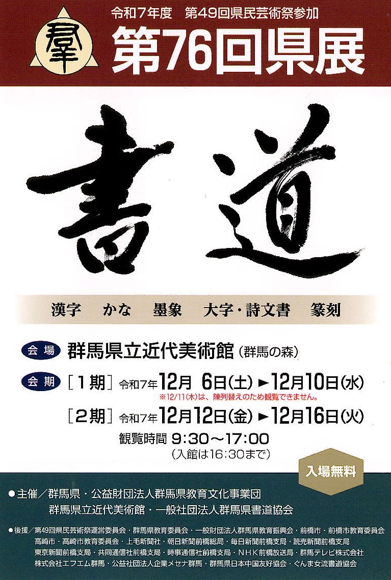 群馬県教育文化事業団 事業団について 団体概要 定款 評議員・役員等名簿 事業計画・事業報告 予算書・決算書 所在地 情報公開・個人情報保護 イベント 県民芸術祭 県民芸術祭とは 参加・協賛事業 山﨑種二記念特別賞 GUNMAマンガ・アニメフェスタ 刊行物 各種様式 高等学校等奨学金 奨学金TOP 希望する方へ 貸与中の方へ 返還中の方へ 「第76回群馬県書道展覧会」開催について 県立近代美術館にて、公募から選ばれた入賞・入選作品と県書道協会委員・委嘱作家等の作品を展示します。 [会期]12月6日(土)~16日(火)9:30から17:00(入場は16:30まで) [会場]県立近代美術館 [入場料]無料 [問合せ]文化課 ☎027-224-3960(8:30~17:00 ※日曜・月曜・祝日をのぞく) ▲TOP