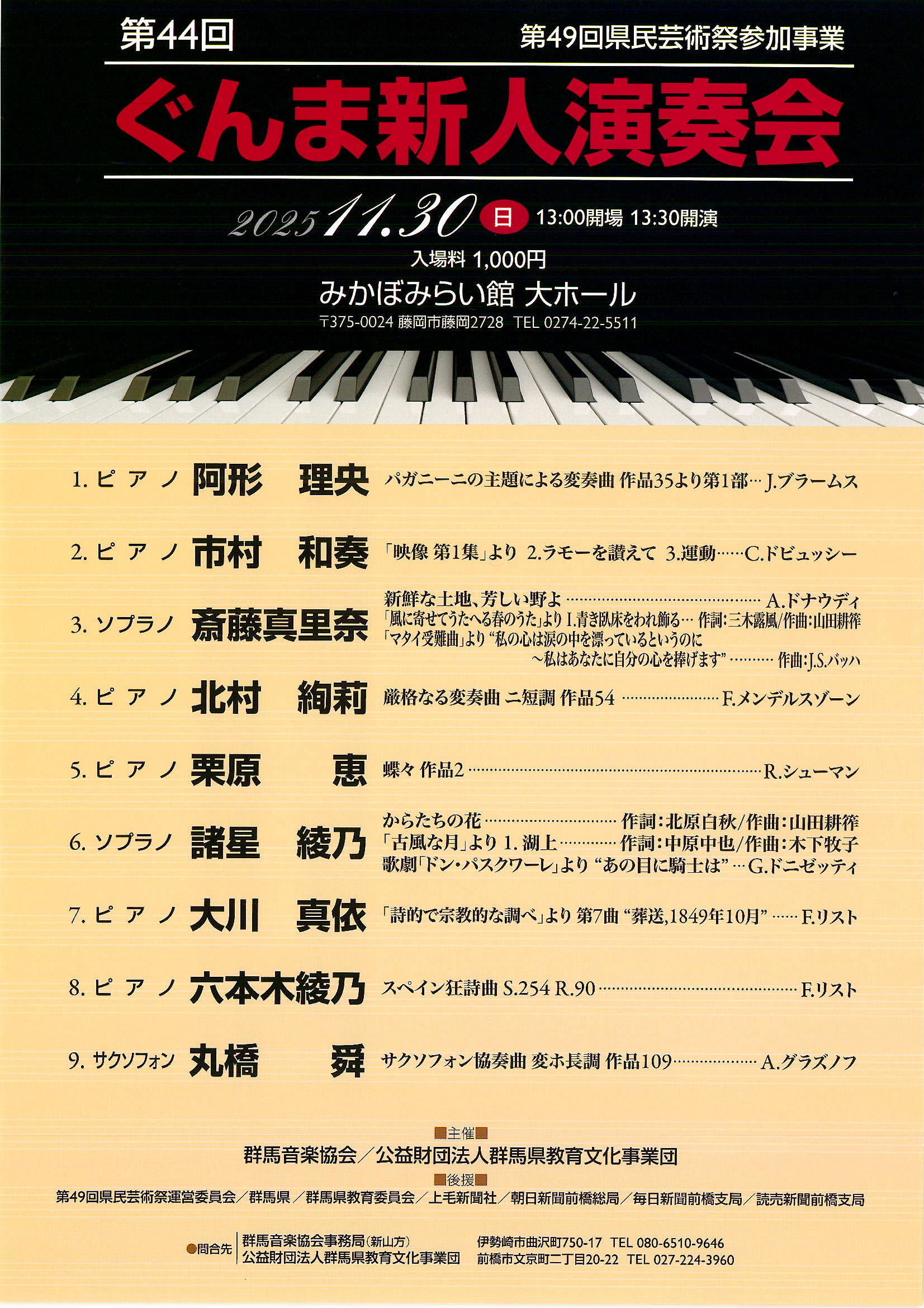 群馬県教育文化事業団 事業団について 団体概要 定款 評議員・役員等名簿 事業計画・事業報告 予算書・決算書 所在地 情報公開・個人情報保護 イベント 県民芸術祭 県民芸術祭とは 参加・協賛事業 山﨑種二記念特別賞 GUNMAマンガ・アニメフェスタ 刊行物 各種様式 高等学校等奨学金 奨学金TOP 希望する方へ 貸与中の方へ 返還中の方へ 「第44回ぐんま新人演奏会」開催について 令和7年11月30日(日)藤岡市みかぼみらい館にて「第44回ぐんま新人演奏会」を開催します。 [期 日]令和7年11月30日(日)13:30開演(13:00分開場) [会 場]藤岡市みかぼみらい館 大ホール [入場料]1,000円(全席自由)※当日券のみ [問合せ]文化課 ☎027-224-3960(8:30~17:00 ※日曜・月曜・祝日を除く) ▲TOP